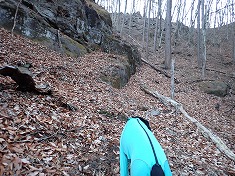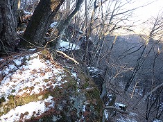 | 大岩が並ぶ上部に向かって登ってゆく。970m付近。 | 1010m付近。主尾根に乗る | 1010m付近に見られる熊だな。 | 少し西に戻っての1000m肩は展望地。 |