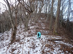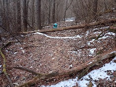 | 市町界に乗る。1125m付近 | 市町界尾根にはペンキとマーキングが乱打。 | 平尾富士側よりの林道に乗る。 | 東進している二人分のトレースが見られた。 |