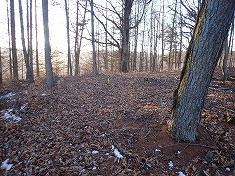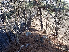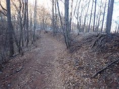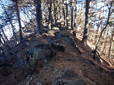 | 1110m付近に広みあり。古い山道があり変則四差路のよう。 | 88番標柱の場所から北に下りだす。 | この付近は山栗が多く、そのためにクマが生息しているよう。 | 1060m付近。大岩が並ぶ尾根の東側を通過して降りてゆく。 |