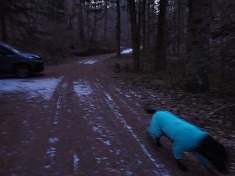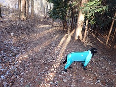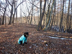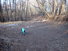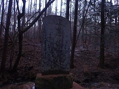 830m付近で林道に降り立つ。これは往路で選ばなかった方の林道で、北に進むとY字分岐となり、水神碑のある場所に出た。この時に、西側で動く気配が感じられた。小屋のある場所であり、人が居るのかと水神碑の裏を見る風を装い西側を見ると、男性がこちらを気にしながら動いていた。と言うことは、往路の時にも小屋の中に居たので薪ストーブからの匂いが漂っていたようだった。それは夜明け頃でもあるので、寝泊まりしていると判断できた。住んでいるのか・・・こんな場所に・・・。水神碑があるくらいなので水は沢から得られるが電気は引いていない場所だった。こちらが林道を北に動き出すと、同じように人影が北に動いていた。まあよそ者が入ってきているわけであり気になっただろう。ましてや黒い大きな動物を連れているのだから・・・。北に降りて行き駐車余地に戻る。
