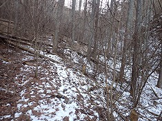 | 835m付近で、沢沿いの道は止まっており、ここから西に入る道へ進む。 | 890m付近。倒木が多く使われていないのが判る。 | B920m付近で主谷を離れる。沢を跨いで東側に進む。 | 東に登ると、谷地形の右岸に薄い道形が在る。950m付近。 |