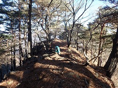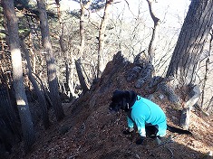 北に降りる尾根の西側はゲジゲジマークが並ぶ場所。尾根頂部は地形図では優しそうな表情だが、1095高点下側は大きな露岩が並ぶ場所で、それに対し谷寄りに伝わないと抜けられない場所だった。この露岩帯が終わるのが1030m付近で、以下はたおやかな尾根に変わるが、965m付近から再び露岩尾根となりゴジラの背を歩いているかのようだった。痩せ尾根となりリッジ状の場所を足場に気を付けながら降りて行く。