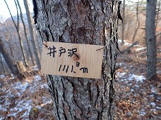 1111m肩に登頂。広い場所で、すぐには標石が目に入ってこなかった。苔むした人工物があり、黄色い杭が伴っていた。最初これかと思ったが、標石にしては小さい。四等なので小さくていいのだが、それでも小さかった。これはおそらく林班の境界標柱だろう。ちなみにと足で蹴ってみたら、簡単に動いた。その北側に同じように黄色い杭を伴った人工物が在った。ここには赤い杭もあり、これが井戸沢四等点の場所だった。標石ではなく金属標であった。そして点の北東の立ち木に標識が縛られ、点名が記されていた。まだ新しいので、最近登られて設置されたようだった。木々の間から浅間山が見える。