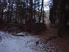 | 830m付近で林道に降り立つ。 | E小屋の場所に戻ると、男性の姿が見えた。雪面には車の轍や足跡があり、ここで生活しているよう。 | F戻る。 |