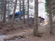 | 豊昇から林道木の久保線に入る。 | B沢を橋で渡って780m付近に3台分の余地がある。 | A大きな水神碑が立つ。この道向かいに大きな小屋が在る。 | A小屋からは薪の匂いがしており、使われてようだった。 |